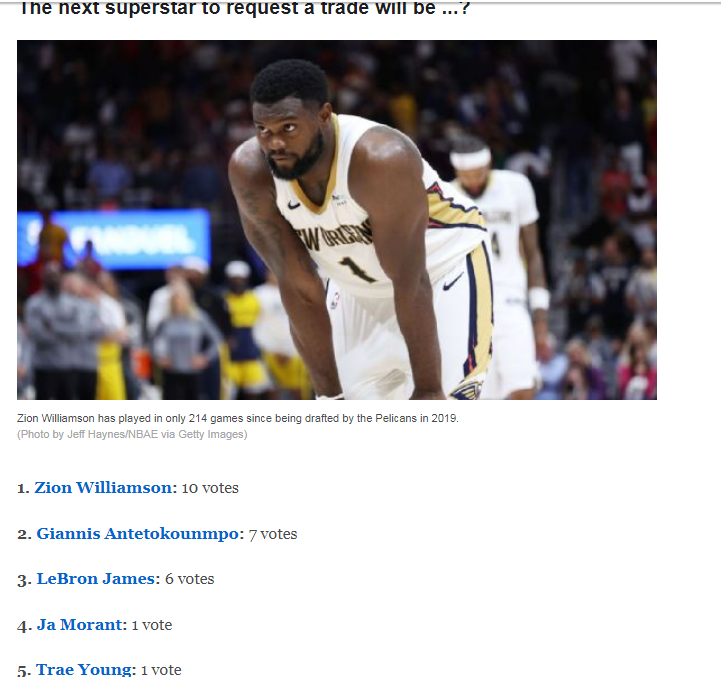 锡安获得10票最被看好会申请交易,对此ESPN名记Tim MacMahon点评表示:“锡安在鹈鹕的去留,或许会因球队管理层变动而出现转机,因而乔-杜马斯已取代大卫-格里芬成为鹈鹕的主要决策者。如果锡安能在新赛季开局打出强势表现,并且能够摆脱困扰其生涯的伤病魔咒,他很可能会寻求新的起点,而继续留在停滞不前的鹈鹕。”